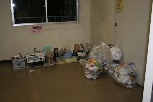 Dies war der Blick aus “meiner” Küche am Samstag, die Müllbeutel gehören sogar dahin 🙂 Dort ist unsere Sammelstelle und einmal in der Woche (was heute ist, ich hab sowas von keine Lust aufs sauber machen) werden sie fortgeschafft (im Mädelswohnheim passiert das wohl alle 2 Tage). Die Sammlung an Küchenutensilien, Sake, Reis und was weiss ich noch alles im Hintergrund tauchte dort vor kurzem auf. Es soll wohl aus der Küche stammen, das Zeug hab ich dort aber vorher nie gesehn. Wer es dahin getan hat und warum, weiss ich nicht. Ich weiss nur es scheint keinen zu interessieren und weil draussen alles voll ist hat sich in der Küche schon ein kleiner Ableger davon gebildet 🙁